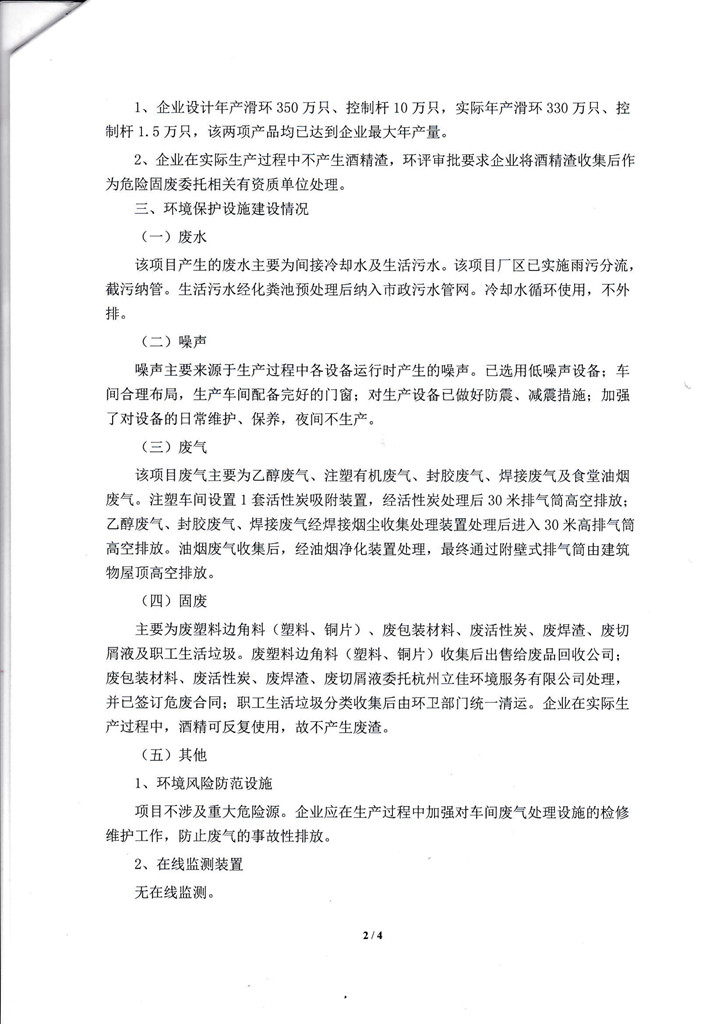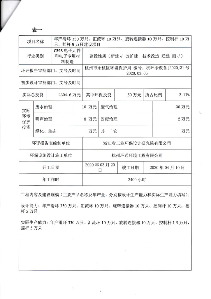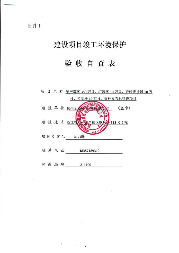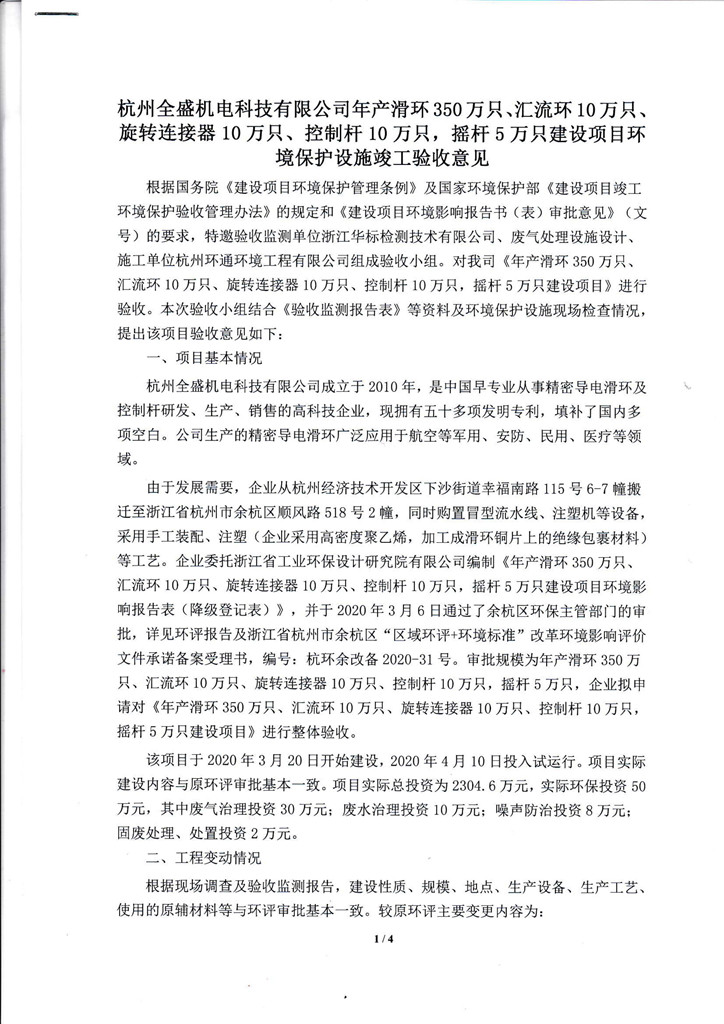 項(xiàng)目名稱:杭州全盛機(jī)電科技有限公司年產(chǎn)滑環(huán)350萬只、匯流環(huán)10萬只、旋轉(zhuǎn)連接器10萬只、控制桿10萬只,搖桿5萬只建設(shè)項(xiàng)目環(huán)境保護(hù)設(shè)施竣工驗(yàn)收